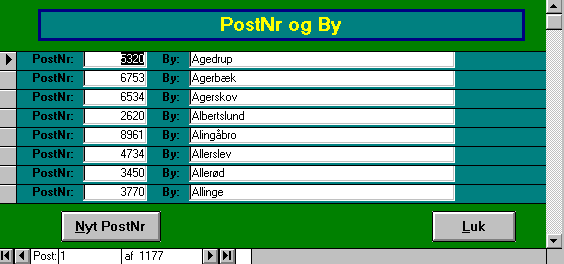 Når du har klikket på Postnumre, kommer denne lille skærm op oven på Hovedmenuen. Du kan her tilføje, slette eller ændre postnumre og bynavne.