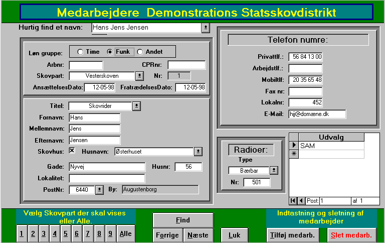 Her indtastes og ændres hoved dataerne i databasen om den enkelte medarbejder. Det er dataer som f.eks. navn, adresse, telefonnumre osv..