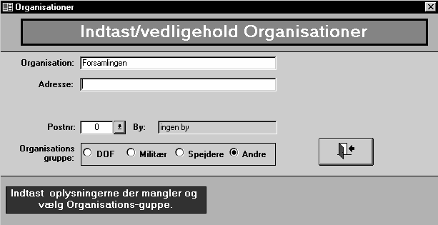 for at komme tilbage til indtastningen af anmeldelsen. Databasen har nu gemt oplysningerne om Organisationen så de ligger klar næste gang der er en anmeldelse.